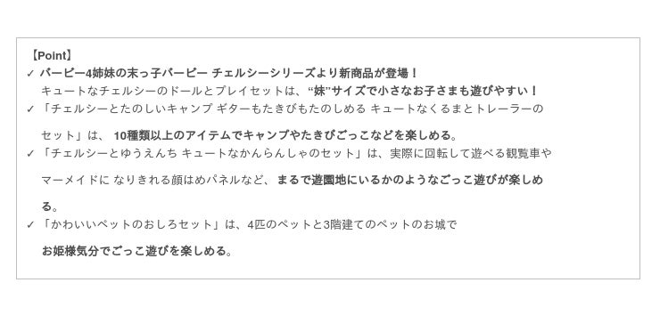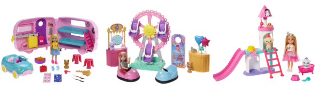 「チェルシーとたのしいキャンプ ギターもたきびもたのしめる キュートなくるまとトレーラーのセット」「チェルシーとゆうえんち キュートなかんらんしゃのセット」~「かわいいペットのおしろセット」も発売中~