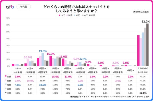 パフォーマンステクノロジーネットワーク「afb(アフィビー)」< https://www.afi-b.com/ >の開発運用をおこなう株式会社フォーイットは、全国の20歳~60歳までの男女500人を対象にスキマ時間に関するアンケートを実施し、年代別等の特徴についてまとめました。