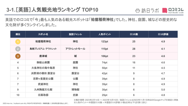 国内最大級のインバウンド総合メディア「訪日ラボ」及び 口コミサイトを”もっと”売上に変える店舗支援SaaS「口コミコム」を運営する株式会社mov(代表取締役:渡邊 誠、本社:東京都渋谷区、以下mov)は、観光名所に寄せられた最新の口コミデータから、独自の『インバウンド人気観光地ランキング』を発表しました。