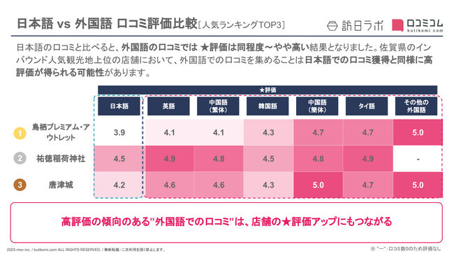 日本語の口コミと比べると、外国語の口コミでは★評価は同程度~やや高い結果となりました。佐賀県のインバウンド人気観光地上位の店舗において、外国語での口コミを集めることは日本語での口コミ獲得と同様に高評価が得られる可能性があります。