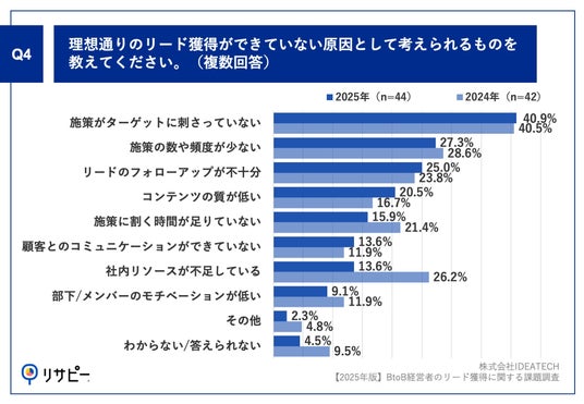 Q3で「あまりそう思わない」「全くそう思わない」と回答した方に、「Q4.「獲得リード数の観点」で、理想通りのリード獲得ができていない原因として考えられるものを教えてください。(複数回答)」(n=44)と質問したところ、「施策がターゲットに刺さっていない」が40.9%、「施策の数や頻度が少ない」が27.3%、「リードのフォローアップが不十分」が25.0%という回答となりました。