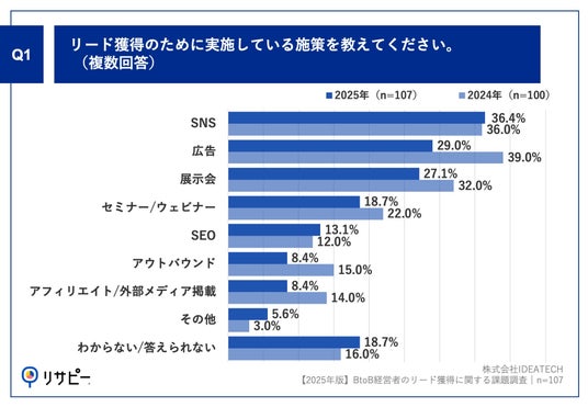 「Q1.リード獲得のために実施している施策を教えてください。(複数回答)」(n=107)と質問したところ、「SNS」が36.4%、「広告」が29.0%、「展示会」が27.1%という回答となりました。