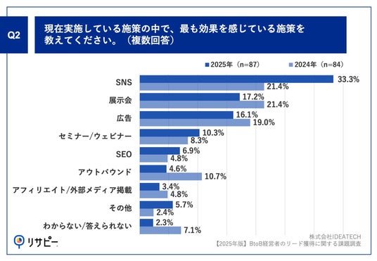 ■現在最も効果を感じている施策 第1位は「SNS」(33.3%)、2024年比11.9ポイント増