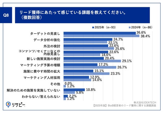 ワンストップでリサーチデータマーケティングを実現する「リサピー(R)️」(https://ideatech.jp/service/research-pr)を運営する株式会社IDEATECH(本社:東京都港区、代表取締役社長:石川友夫)は、リード獲得のための施策を実施しているBtoB企業の経営者107名を対象に、【2025年版】BtoB経営者のリード獲得に関する課題調査を実施しましたので、お知らせいたします。