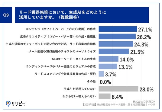 - 03|66.7%が、リード獲得施策で生成AIを活用、「コンテンツ作成」(27.1%)が最多