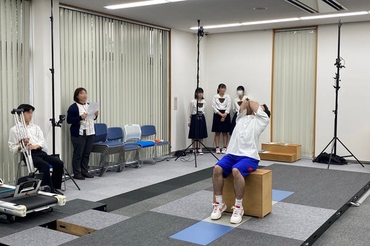 岡山南高校では、岡山県の企業と連携し岡山の魅力を商品化、県内イベントを盛り上げる取り組みを行っています。当社も2020年から一緒に取り組んでおり、今年で5年目になります。2024年は、当社の研究施設に設置している動作解析システム「モーションキャプチャ」を使った胸椎の可動域チェックや、新製品のコンセプトシート作成、アシストスーツミュージアムでの装着体験、運動器年齢を測定できるシステムを使用した身体テストなどを実施しました。