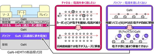 GaN-HEMTは、シリコンを用いたトランジスタよりも出力や効率における性能が優れているため、2000年代半ばに移動通信の基地局向けパワーアンプとして初めて実用化されて以降広く普及しています。しかし、GaN-HEMTは、形状を保つ支持基板と、その上に成長させたGaN結晶を基に製造されますが、当初は異なる材料から成る基板に成長させたGaN結晶を用いていたため、結晶の乱れが生じてしまい欠陥による特性劣化が避けられませんでした。近年では、同一材料のGaNから成る基板が入手できるようになり、GaN結晶の高品質化による特性の更なる向上が期待されており、当社は2021年に、GaN基板に成長させたGaN結晶を用いて従来のSiC基板を凌駕する世界トップの電力変換効率82.8%を達成しています(注5)。