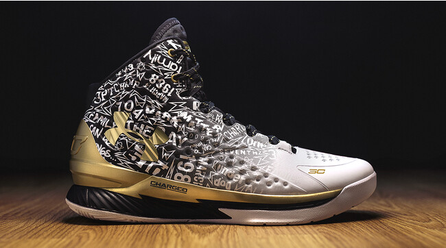 ブラック&ホワイトのグラデーションが目を惹くアッパーには、カリーの誕生日「1988.MARCH14」、彼が最も大切にしている「FAMILY」や、好きな言葉である「UNDERDOG」などの文字が刻まれている。また、ゴールドのヒールカウンターは、黄金に輝くトロフィーをモチーフにしている。