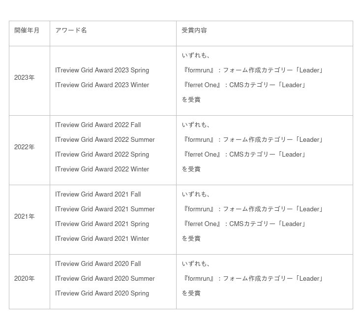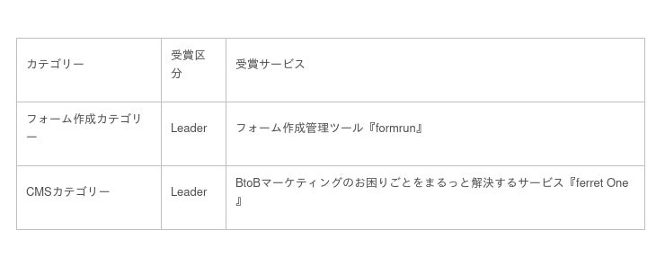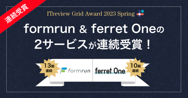 株式会社ベーシック(東京都千代田区、代表取締役:秋山勝、以下「当社」)は、アイティクラウド株式会社(東京都港区、代表取締役社長:黒野源太)が主催するアワード「ITreview Grid Award 2023 Spring」において、当社が提供する フォーム作成管理ツール『formrun(フォームラン)』とBtoBマーケティングのお困りごとをまるっと解決するサービス『ferret One(フェレットワン)』の2サービスについて、「フォーム作成カテゴリー」「CMSカテゴリー」のそれぞれで、満足度・認知度ともに優れた製品であると評価され、「Leader」を同時受賞したことをお知らせいたします。