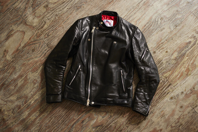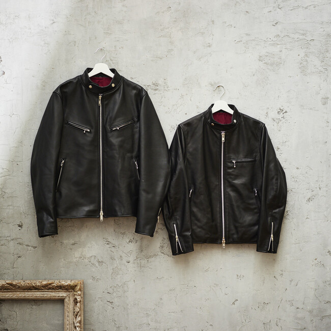 昨年開催時に好評を博したシングルライダースの「クラブマン」に加え、「ニュートロフィー」を展開いたします。「クラブマン」は、両胸に斜めに入った両玉縁仕様のファスナーポケットを、「ニュートロフィー」は片胸ポケットを備えたシングルライダースとなっています。
