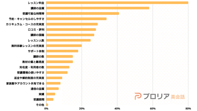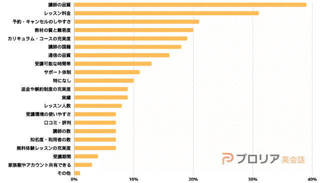 次に「講師の品質」と続き、受講のしやすさに関係する「受講可能な時間帯」「予約・キャンセルのしやすさ」の回答が30%を越えています。