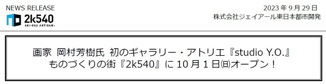 JR秋葉原駅と御徒町駅間の鉄道高架下に位置する、“日本のものづくり”をテーマにした商業施設『2k540 AKI-OKA ARTISAN(ニーケーゴーヨンマル アキオカ アルチザン)』にて、画家 岡村芳樹氏による初のギャラリー・アトリエ『studio Y.O.(スタジオワイオー)』が10月1日(日)11時にオープンいたします。