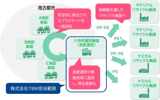 株式会社TBMは、本実証において、横須賀サーキュラー工場の選別設備を使い、茨城県内における複数の自治体による家庭由来の廃プラスチックから、PP/PE、PS、PETを高度選別し、選別された各樹脂をマテリアルリサイクル施設、ケミカルリサイクル施設へ発送する役割を担います。