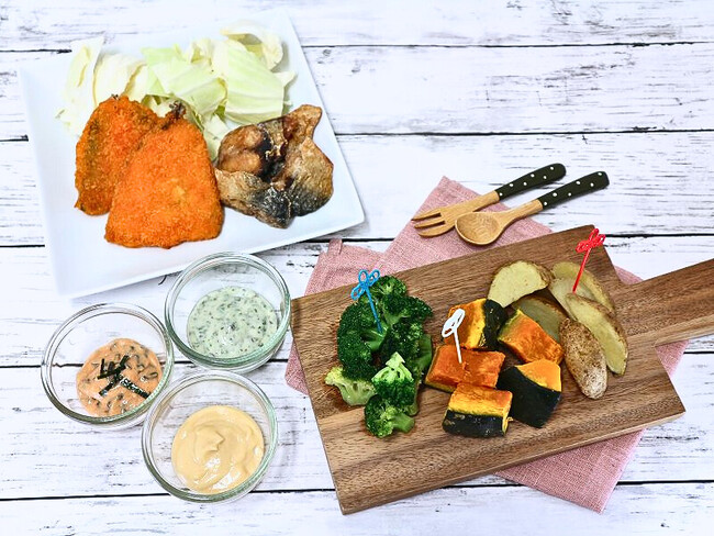 パスタソースを使ったディップソースで楽しむ「おかずおつまみ」は、バランスもよく豪華!今回は、冷凍食品のほかに、カット野菜の『VLざく切りキャベツ』を使用してみました。プレートに盛り付けるだけで一気に食卓が賑やかになりますが、なんといってもディップソースがあることで、味にもグッと変化が出ます。