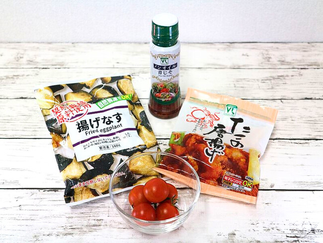 3:[1]の『揚げなす』、『VLたこの唐揚げ』、[2]のミニトマトをボウルなどの容器に入れる