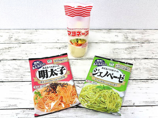 1:『VLあえるパスタソース 明太子』を袋から取り出し、「調味ソース」をよく振っておく