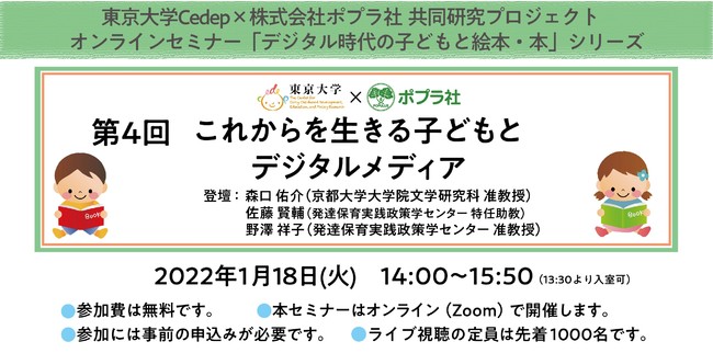株式会社ポプラ社(本社:東京都千代田区、代表取締役社長:千葉均)と東京大学Cedep共同研究「子どもと絵本・本に関する研究」プロジェクトでは、デジタル時代の子どもの発達と絵本・本の関係や、子どもをとりまく絵本・本環境について学びを深めるセミナーを全4回にわたり開催。最終回となる第4回「これからを生きる子どもとデジタルメディア」を1月18日(火)に開催します。>>>https://www.poplar.co.jp/topics/54785.html