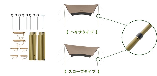 ヘキサタイプのタープ設営に必要な道具が一式揃ったセット。高さ2段階調節可能なポールやペグ、ロープ、ハンマー、収納袋などが付属。シート単品のヘキサタープと組み合わせて使うことができて、片方のポールを低くすれば傾斜をつけてタープを設営する「スロープ構造」にも対応可能。