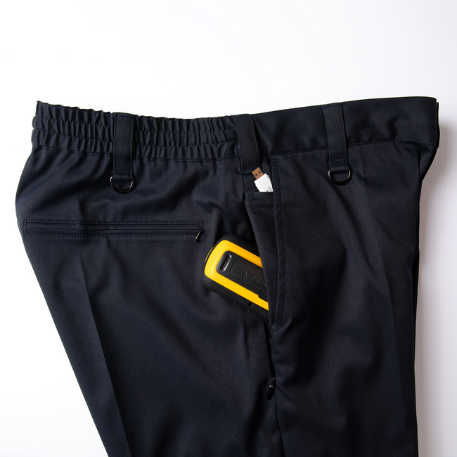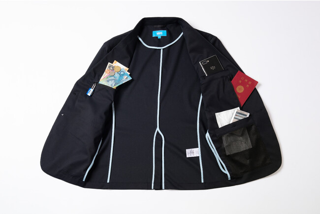 地域によっては鞄を持って出歩くほうが危なく、なるべく荷物を少なくして手ぶらで外出することが多いため、ジャケットパンツ合わせて計14個のポケットを配置。パンツウエスト背面はゴムなのでフライトや長距離の移動でも圧迫感なく着用可能。