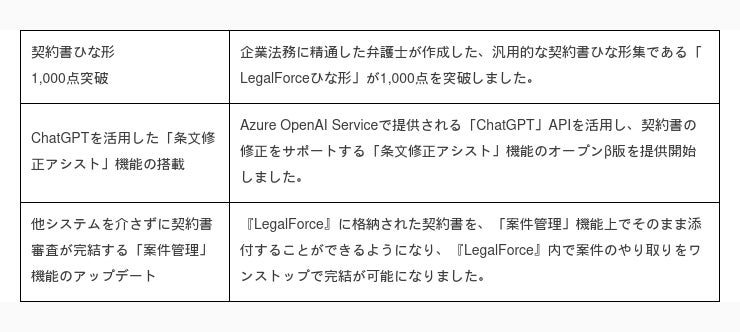 『LegalForce』は日々進化しており、この3か月でも「契約書ひな形1,000点突破」や、ChatGPTを活用した「条文修正アシスト」機能の搭載、『LegalForce』の画面上で他システムを介さずに契約書審査が完結する「案件管理」機能のアップデートなど、多くの新機能リリース・機能アップデート(バグ修正などを除く)を実施しています。