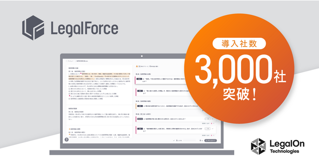 株式会社LegalOn Technologies(本社:東京都江東区 代表取締役執行役員・CEO:角田望)が提供するAI契約審査プラットフォーム『LegalForce』において、2023年8月時点で有償契約にて導入する企業・法律事務所が3,000社を突破したことをご報告いたします。