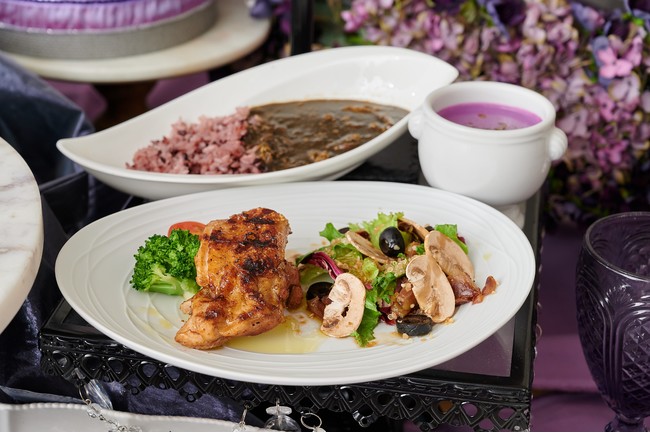 さらにスパイスの効いたグリルチキンや、チャコール(竹炭)で真っ黒に仕上げたカレー、紫芋のポタージュなどの食事もラインナップし、ランチとしてもビュッフェをお楽しみいただけます。