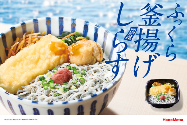 株式会社プレナスは、持ち帰り弁当の「Hotto Motto (ほっともっと)」を、2023年4月末現在、2,452店舗展開しております。このたび「ほっともっと」では、ふっくらとした国産しらすとイカ・ホタテの天ぷらを盛り付けた『釜揚げしらす弁当』550円を、5月18日(木)より発売いたします。