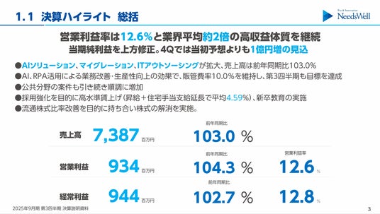 金融向けの業務系システム開発やソリューション・AIに強みを持つ独立系SIerのニーズウェル(本社:東京都千代田区、代表取締役社長 松岡 元)は、本日2025年9月期 第3四半期決算を発表しました。