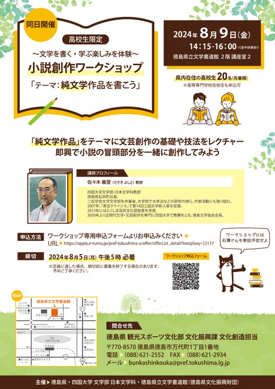 また、徳島県内在住の高校生を対象に「小説創作ワークショップ」を同日開催し、文芸創作の基礎や技法のレクチャー、石澤さんを交えた即興の小説創作など、文学を「書く・学ぶ」楽しみを体験するプログラムを実施します。