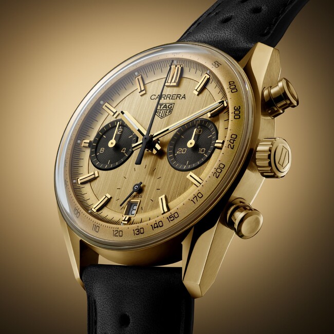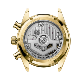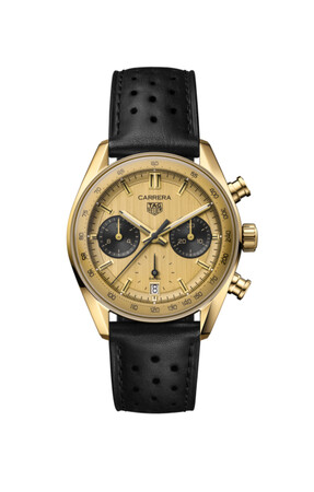 18K3N イエローゴールドのケースのタグ・ホイヤー カレラ クロノグラフは、カレラコレクション60周年の物語を締めくくるに相応しい時計です。このタイムピースにはタグ・ホイヤー カレラの真髄であるタイムレスな要素が変わることなく息づいていており、クラシックなラウンド型ケース、シームレスに一体化したラグ、2時と4時位置に配したユーザーフレンドリーなクロノグラフ用プッシャーなどに見ることができます。プッシャーは、ヴィンテージの魅力とモダンな雰囲気を優雅に融合させる役割を果たしています。