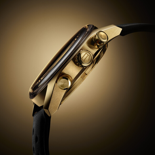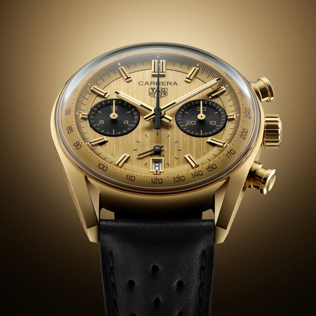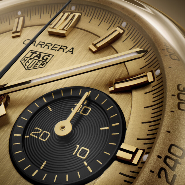 カレラ60周年の集大成を飾るのは精緻なゴールドのケースのタグ・ホイヤー カレラ クロノグラフです。目を引くのは時計全体の美しさを包み込む独創的なグラスボックスデザインです。横から見ると、シームレスに弧を描くドーム型サファイヤクリスタルは流れるようなシルエットを、一方で、ぴんと張りつめたようなケース側面と力強くアヴァンギャルドなラグは美しいシルエットを作り出しています。この革新的なシルエットは、2023年のカレラコレクションに新たな息吹を吹き込み、視覚的なエレガンスを高め、このタイムピースをコレクションの中心を担う時計へと昇華させました。優雅にカーブを描くフランジは、文字盤の縁を囲む60秒/分目盛りの読み取りやすさにつながっています。