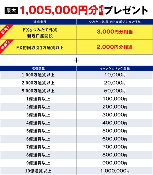 2. 取引期間中の新規約定数量の合計が1,000万通貨以上のお取引(1.が未達成でも、下記「■プレゼント条件」記載のお取引数量およびキャッシュバック金額により、条件達成者全員にキャッシュバック)