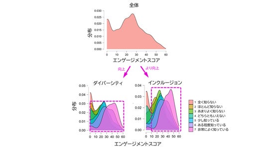 図5.エンゲージメントスコアの全体分布と「ダイバーシティ」「インクルージョン」の認知度別の分布