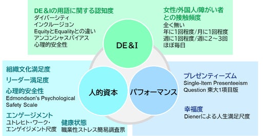 本調査では日本企業におけるDE&Iの実態と推進効果の検証および戦略的に進展させる契機づくりを目的とし、DE&Iに関する用語の認知度、障がい者との接触頻度などの「DE&I指標」、組織文化満足度、組織のリーダー満足度、心理的安全性、ワークエンゲージメント[4]、健康状態に関する「人的資本指標」[5]、プレゼンティーズム[6]、幸福度に関する「パフォーマンス指標」について、非公開型のインターネット調査を用いて検証を行いました。(図1)