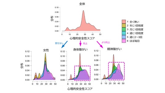 図6.心理的安全性の全体分布と「女性」「身体障がい者」「精神障がい者」の接触頻度別の分布