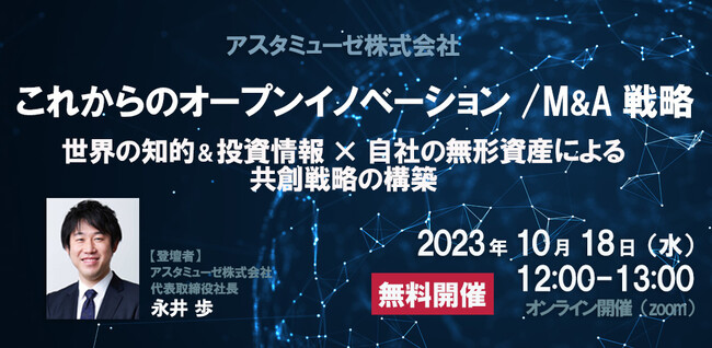 アスタミューゼ株式会社(本社:東京都千代田区、代表取締役社長 永井歩)は、2023年10月18日(水)12:00~13:00に、業界を問わず、提携/M&A/CVC等のオープンイノベーションを推進されている方、サステナブルな事業戦略を検討されている事業企画の方を対象とした無料ウェビナー「これからのオープンイノベーション / M&A戦略 ~世界の知的&投資情報×自社の無形資産による共創戦略の構築~」を開催いたします。2023年6月に実施した同タイトルのウェビナーが大変好評だったため、4か月ぶりの再開催となります。