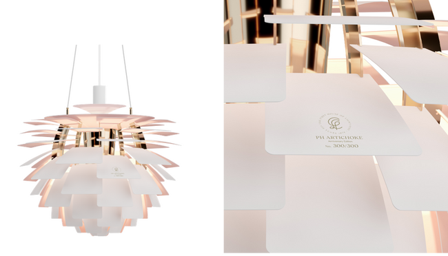 1958年にポール・へニングセンが、コペンハーゲンにあるレストランのためにデザインした「PH アーティチョーク」。アニバーサリーエディションには、1枚の羽根のマットホワイト面に、限定販売数300点のナンバーが刻印されます。絶妙なカーブが施された72枚の羽根が創り出す彫刻のようなフォルムと、職人の高度な技術により、どの角度から見てもまぶしさのないグレア・フリーの光で空間を幻想的に彩ります。