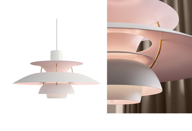 「PH5」 は、1958年に近代照明の父とも呼ばれるポール・へニングセンによってデザインされた、世界中で愛される名作照明です。アニバーサリーモデル共通の仕様であるマットホワイトとペールローズのセードから放たれるソフトで温かみのある光は空間を美しく彩ります。艶のある真鍮色の支柱がアクセントとなり、モダンスタイルにも調和するカラーコンビネーションです。