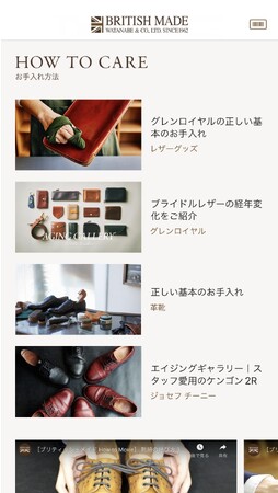 ブリティッシュメイドで展開するグレンロイヤル製品の正しいお手入れ方法や、革靴のケア方法など、ご自宅で愛用品をお手入れ方法に関するコンテンツを掲載。お気に入りの製品を長く美しくご愛用いただけるよう、製品ご購入後もアプリがサポートいたします。