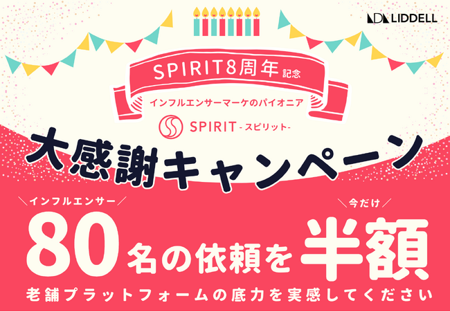 SNS・インフルエンサーマーケティング事業を展開するLIDDELL株式会社 (本社:東京都港区、代表取締役:福田 晃一、以下リデル)は、インフルエンサーのマッチングプラットフォーム『SPIRIT(スピリット)』の8周年を記念し、通常300万円分のインフルエンサータイアップ費用を、半額の150万円で提供致します。登録インフルエンサー30,000人の中から、特に熱量の高い80名とマッチング!質が高く安心できるインフルエンサーにタイアップ投稿を依頼できるキャンペーンを開催します。