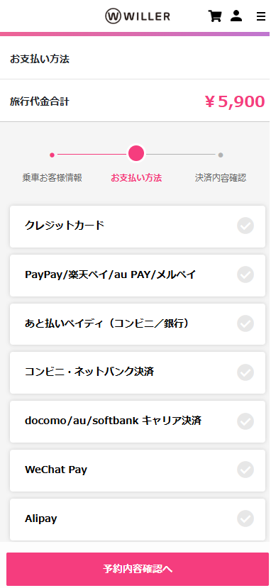 ※支払い方法に関しては、こちら(https://travel.willer.co.jp/guide/payment/howto.html)をご覧ください。