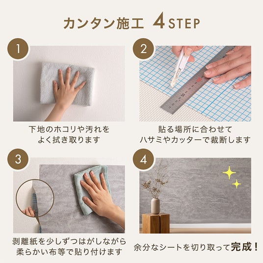 本製品は、DIY初心者でも扱いやすい設計に加え、賃貸住宅でも既存の壁紙を傷めにくく、糊残りの心配なく使用できる点が特長です。