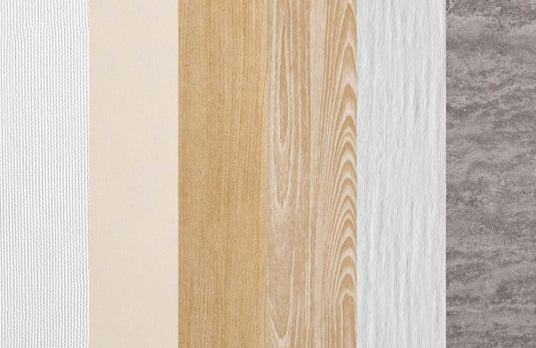(画像:左から順にオフホワイト、ライトベージュ、ライトオーク、シャビーアッシュ、ホワイトウッド、モルタルグレーの壁紙カラー一覧)