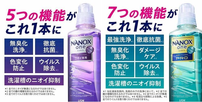 『NANOX one』は、 近年、部屋干し文化が主流となっている中で、「ニオイ汚れを落とす」という独自の訴求にて、展開している商品となっております。『NANOX one』の通常機能である「皮脂汚れを落とす」という部分も性能を発揮し、外干し・部屋干しの両方に対応できる洗濯用洗剤です。