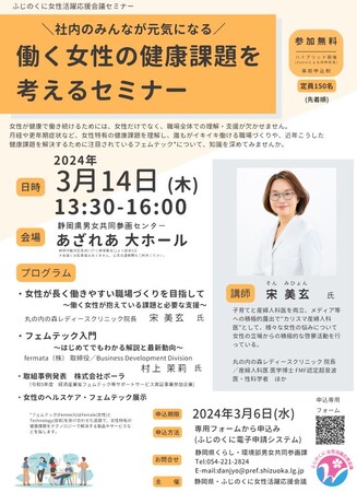 女性特有の健康課題を理解し、誰もがイキイキと働ける職場づくりや、こうした健康課題を解決する手段として注目されているフェムテック(※)についての知識を深めるため、働く女性、人事労務・福利厚生担当者を対象としたセミナーを開催します。