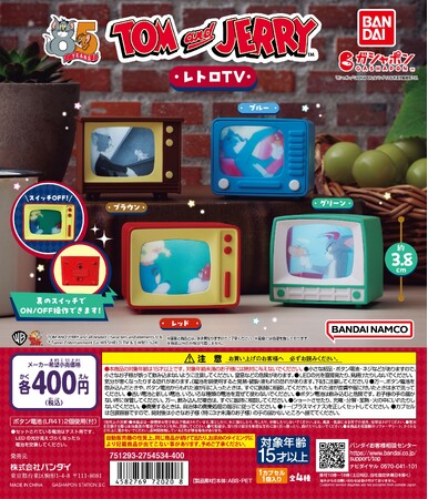 株式会社バンダイ ベンダー事業部(本社:東京都台東区)は、ワーナーブラザース・ディスカバリーグローバル・コンシューマープロダクツとのパートナーシップのもと、『トムとジェリー レトロTV』(1回400円・税10%込、全4種)を2024年11月第4週から順次、全国のガシャポンバンダイオフィシャルショップ、玩具売場、量販店、家電店などに設置されたガシャポン自販機シリーズにて発売いたします。