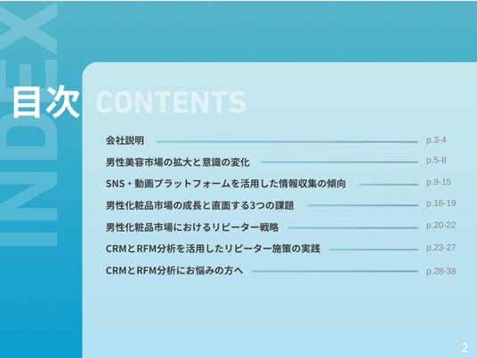 本レポートでは、競争が激しくなる男性化粧品市場において、お客様との関係を深めるための情報管理(CRM:顧客関係管理)や、「最近の購入日・購入頻度・購入金額」の3つの視点でお客様を分類する方法(RFM分析)を活用し、リピーターを増やし育てるためのマーケティング施策について解説しています。