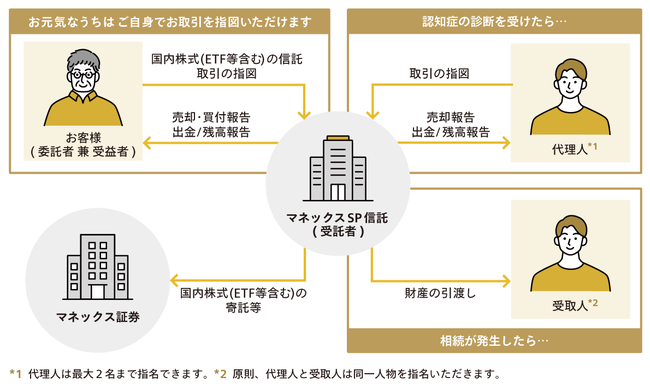 2021年9月に開始した株式管理サービス「たくす株」は、証券業界初(※)となる「信託」という仕組みを活用し、お客様が保有する国内上場株式(ETF等含む)を「たくす株専用口座」で預かり、万が一、お客様が認知症になった場合には信託契約に基づいてご家族が売却・出金をできるように設計されたサービスです。