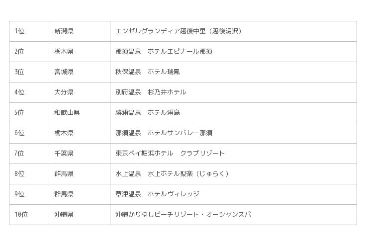 「お客様の声」のお食事評価が4点以上の宿を対象に、「バイキング」プランを予約したファミリー利用者の宿泊人泊数(宿泊延べ人数)を元に集計した結果、1位は新潟県の「エンゼルグランディア越後中里(越後湯沢)」、2位は栃木県の「那須温泉 ホテルエピナール那須」、3位は宮城県の「秋保温泉 ホテル瑞鳳」がランクインしました。