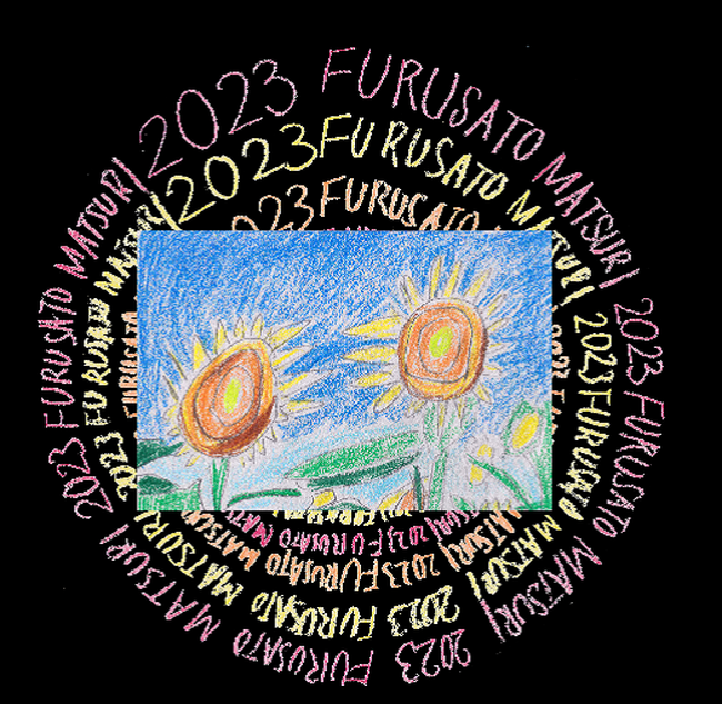 NPO法人みのり福祉会 障がい者就労・生活さぽーとピースの作品は、「輪」をテーマに描いたもの。中心には、太陽に向かって元気に成長するひまわりの華やかさと力強さとが、夏の装いに彩りを添え、賑やかなふるさとまつりの様子を想起させてくれます。
